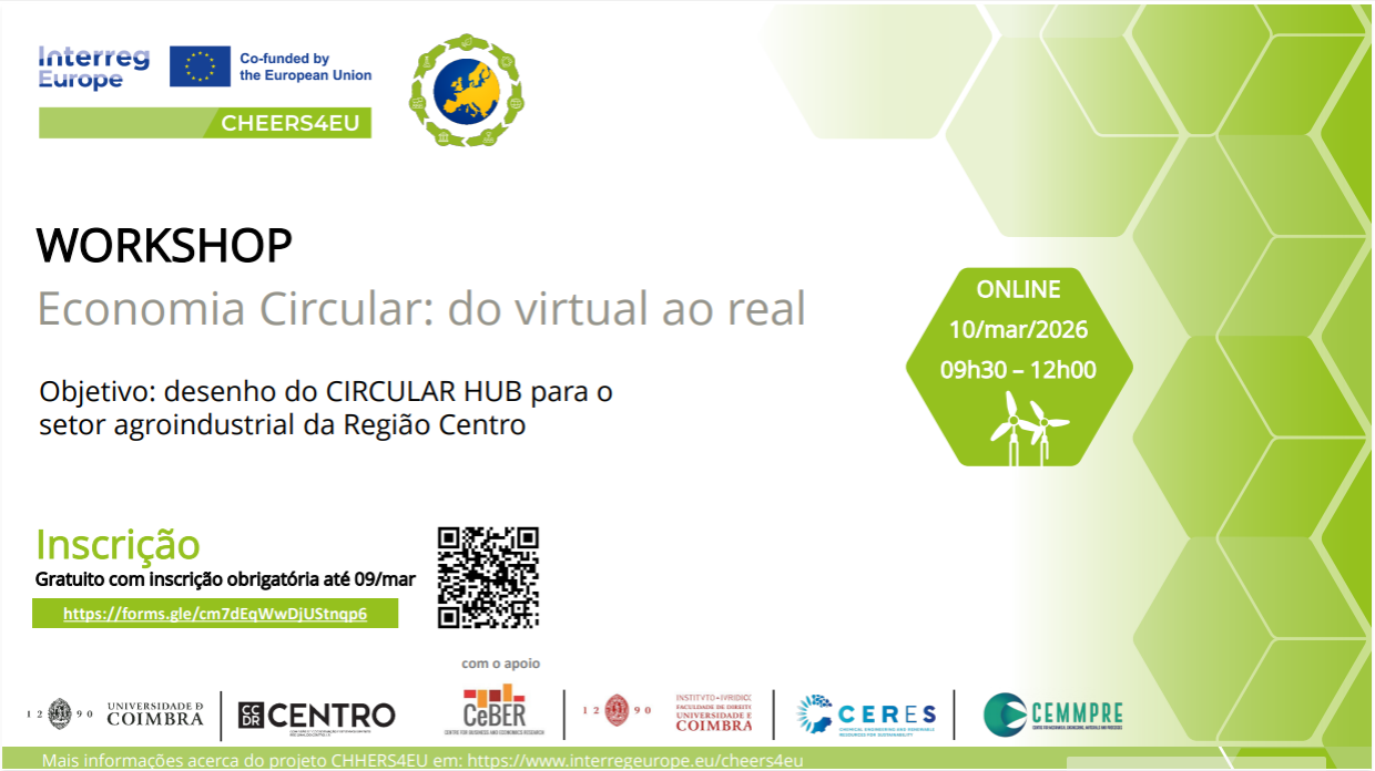A Universidade de Coimbra (UC), juntamente com outros parceiros europeus da Holanda, Finlândia, Áustria, República Checa, Dinamarca e Espanha, e no âmbito do projeto Interreg-Europe CHEERS4EU, do qual a CCDR Centro é parceira associada, pretende apoiar a transição para uma Economia Circular na região Centro de Portugal, com vista à cocriação de um Hub Circular para o setor agroindustrial que possa acelerar a circularidade deste setor crítico.